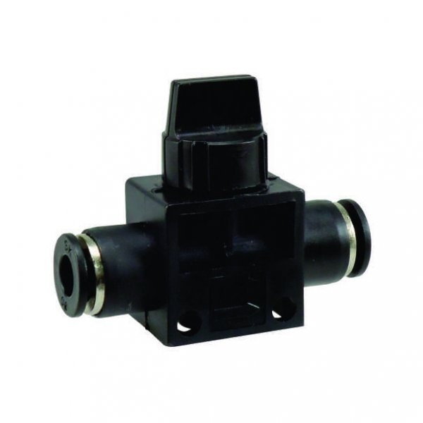 Válvula 3/2 vias com acionamento manual (giro) e montagem em linha (tubos). Faz o bloqueio da pressão de entrada e libera o escape de ar do circuito quando operada. Utilizada em entrada de circuitos ou máquinas, dando a possibilidade para despressurizarão em intervenções.