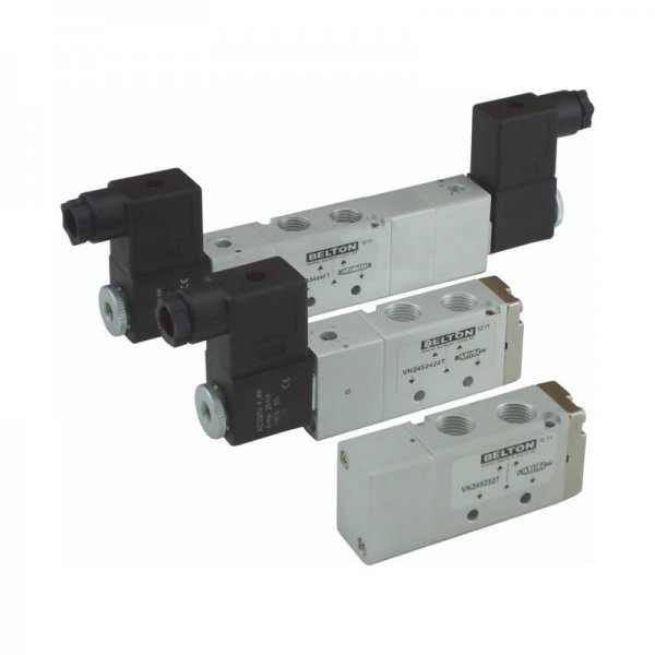 Válvulas direcionais de bitola 1/4" com atuação elétrica e pneumática e fixação vertical (para blocos). Conta com conjunto completo de montagem: 5/2 e 5/3. A série VN diferencia-se pelo seu tamanho reduzido, robustez e fácil manutenção.